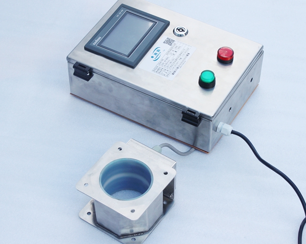 原料從料斗或送料器自由下落進(jìn)入金屬分離器,如果沒有金屬雜質(zhì),原料會直接通過金屬分離器流向下端的出料口。如果檢測器檢測到原料中含有金屬,那么控制器立刻啟動分離板將金屬物和部分原料一起導(dǎo)向側(cè)面的排料口,然后分流板迅速恢復(fù)至正常的位置,分流板速度可調(diào),金屬分離器的檢測精度也可根據(jù)生產(chǎn)需要調(diào)節(jié),最小可檢測并分離出Φ 0.2mm的金屬顆粒。