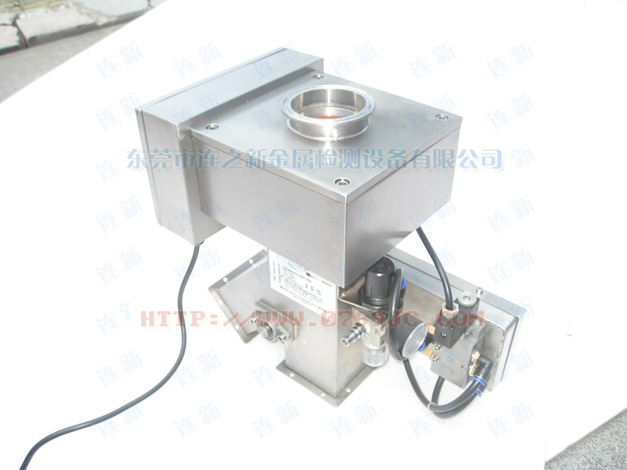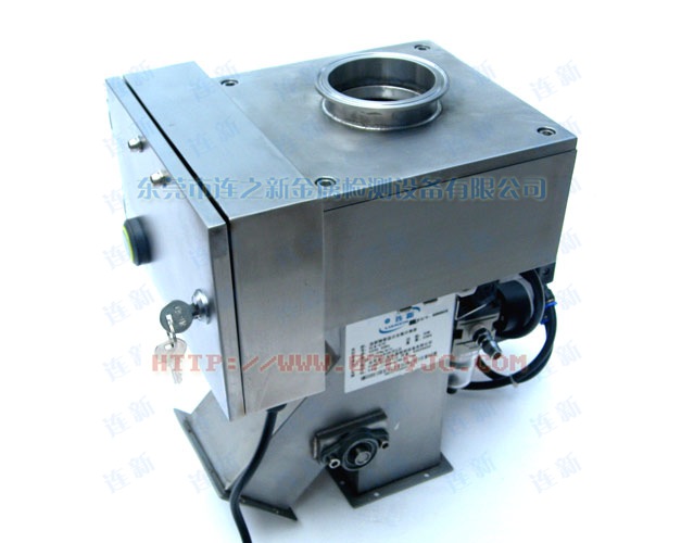 原料從料斗或送料器自由下落進入金屬分離器,如果沒有金屬雜質(zhì),原料會直接通過金屬分離器流向下端的出料口。如果檢測器檢測到原料中含有金屬,那么控制器立刻啟動分離板將金屬物和部分原料一起導向側(cè)面的排料口,然后分流板迅速恢復至正常的位置,分流板速度可調(diào),金屬分離器的檢測精度也可根據(jù)生產(chǎn)需要調(diào)節(jié),最小可檢測并分離出Φ 0.2mm的金屬顆粒。